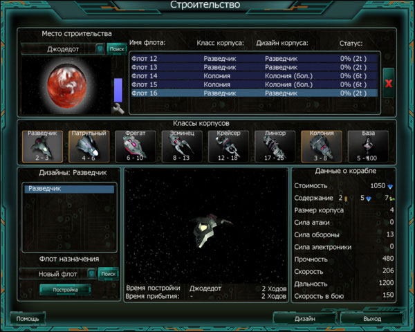 В разделе «Дизайны» отдаётся собственно приказ на постройку. Здесь указана категория выбранного корабля и флот, к которому он приписан. В выпадающем меню можно выбрать существующий флот или создать новый. Когда всё будет готово, нажмите на кнопку «Постройка». В графическом разделе представлено схематическое изображение выбранного корабля, а также указаны срок строительства и время, через которое этот корабль займёт своё место в выбранном флоте. В разделе «Данные» представлены различные сведения о корабле: стоимость постройки и содержания, размер корпуса, сила атаки, прочность, межзвёздная скорость, дальность полёта и скорость в бою. Дизайн![]() Окно дизайна даёт игроку возможность применить свои творческие способности. По мере развития технологий будут разрабатываться новые корпуса и новое оборудование для кораблей. Если какая-либо технология позволяет вам усилить мощь и быстроходность своих кораблей, не забудьте использовать её на практике! Кроме раздела корпусов в окне есть ещё четыре раздела: Особенности класса — скорость, защита и сила выбранного корпуса. Название и Данные — название модели и более подробная информация о корабле. Чем больше установленного снаряжения, тем сильнее корабль, но и тем выше стоимость его постройки. Снаряжение — снаряжение для установки на корабль. Установленное снаряжение перечислено в правой части раздела и выделено фиолетовой подсветкой. Свободное место — учёт свободных слотов (мест для установки снаряжения) и их расположения. Здесь же находится кнопка «Активация», активирующая дизайн. Кнопка «Сброс» позволяет удалить проект и приступить к новому. Основные характеристики различных корпусов: