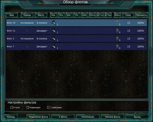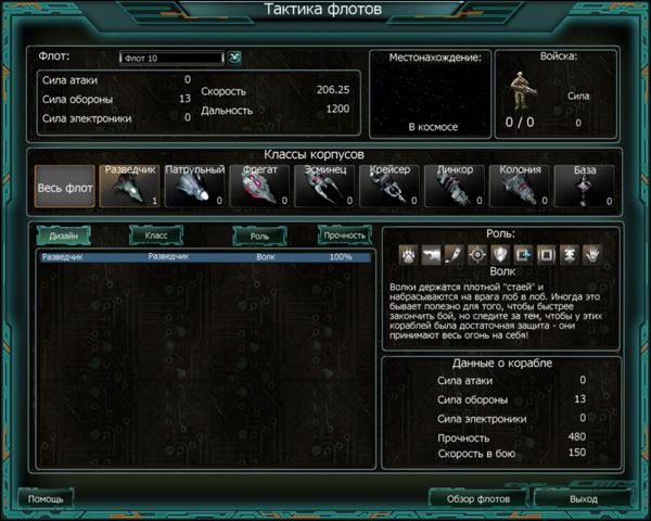 Список флотов можно сортировать при помощи «Условий фильтра». Фильтр «В пути» выделяет все корабли, перемещающиеся в определённом направлении (с активными точками маршрута). Фильтр «Повреждён» показывает все повреждённые корабли. Фильтр «С войсками» отображает все флоты с войсками на борту. Разделение флота и перевод отрядовВ окне перевода отрядов можно либо разделить флот на две части, либо перевести корабли и отряды из одного флота в другой. Обратите внимание на то, что при перемещении отрядов два флота должны находиться поблизости друг от друга. Чтобы открыть это окно, щелчком левой клавиши мыши выберите первый флот на звёздной карте, затем щелчком правой клавиши мыши выберите второй флот. Окно поделено на две половины, каждая из которых соответствует отдельному флоту. Если во флоте много кораблей, то их список можно отсортировать по классу. Для перевода корабля из одного флота в другой достаточно щёлкнуть по его названию мышкой. Для перевода батальонов укажите количество и щёлкните по стрелке в соответствующем направлении. Если вы желаете объединить два флота, щёлкните по кнопке «Объединить». Тактика флота![]() В этом окне задаётся тактика флотов в бою. В разделе «Флот» показана общая информация о выбранном флоте. Значки с изображением различных типов корпусов позволяют отсортировать список кораблей флота по классу (если вы желаете задать подробную тактику). Каждому отдельному кораблю или группе кораблей можно задать свою роль в бою. Всего существует девять ролей, каждая со своими стратегическими особенностями: Охотники — стараются обойти основную группу кораблей противника с фланга и атаковать более слабые корабли поддержки. В качестве охотников лучше назначать достаточно быстрые корабли, чтобы они успели зайти с тыла до того, как закончится бой. «Волки» — держатся плотной «стаей» и набрасываются на врага лоб в лоб. Иногда это бывает полезно, для того чтобы быстрее закончить бой, но следите за тем, чтобы у этих кораблей была достаточная защита от неминуемых повреждений. Хирурги — держатся на расстоянии и обстреливают корабли поддержки, передвигающиеся с вражескими истребителями. Эти корабли лучше всего снабдить орудиями дальнего действия. Снайперы — их тактика похожа на тактику Хирургов, за исключением того, что они обстреливают корабли с наиболее опасными орудиями. Их тоже лучше снабдить орудиями дальнего действия. Стражи — держатся в тылу и защищают слабые корабли флота, перехватывая охотников и другие вражеские корабли, которые приближаются к ним на достаточное расстояние. ЭОН — корабли поддержки авангарда, которые выдвигаются с основными атакующими силами, следует усилить электронными системами. ЭОЗ — корабли поддержки тыла должны находиться достаточно далеко от линии боя, поддерживая более слабые корабли своего флота. Их следует усилить электронными системами. Звёздные базы — как правило, звёздные базы остаются на одном месте и открывают огонь по кораблям противника, приближающимся к ним на достаточное расстояние. Если в вашем флоте имеется несколько мощных звёздных баз, то неплохой тактикой будет дождаться, пока враг сам подойдёт к вам. Без оружия — как следует из названия, они не несут орудий и потому избегают столкновения с кораблями противника. По возможности они держатся рядом со Стражами