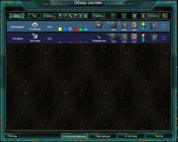Звёздные системы![]() Основную информацию о планетарной системе можно получить в окне Обзор систем. Здесь же можно поменять класс системы и назначить для каждой из них степень обороны. Информация о каждой отдельной системе содержится в отдельной строке. Первая колонка — имя планеты. Его можно поменять в любое время. Тип системыСледующая колонка — тип планетарной системы. Каждой отдельной колонии можно назначить свой тип. Его тоже можно поменять в любое время, но не забывайте, что при этом отменяются особые возможности (например, способность служить центром торговых путей). Кроме того, если инфраструктура какой-либо отрасли (сельское хозяйство, добыча минералов, строительство и т. д.) развита сильнее, чем это дозволяется новым типом, то она постепенно опустится до максимально возможного уровня.